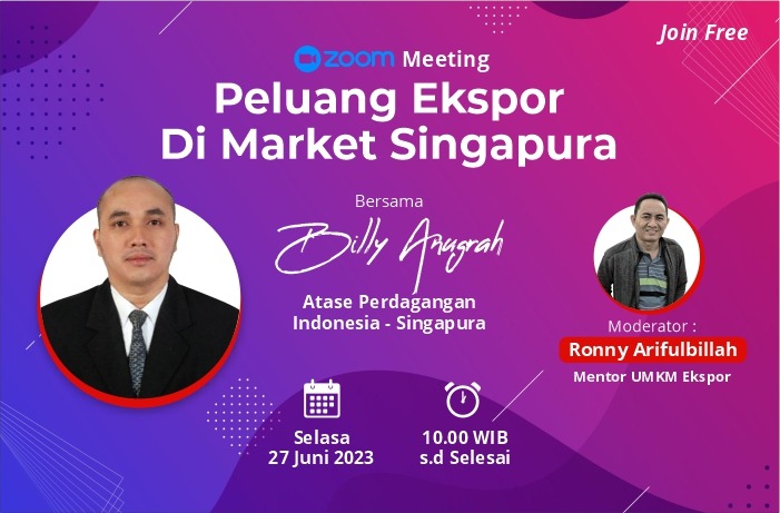 Kali ini kami akan mengadakan Webinar dengan Judul “Peluang Export Di Market Singapura.” Bersama Atase Perdagangan Singapura Bapak “Billy Anugrah”